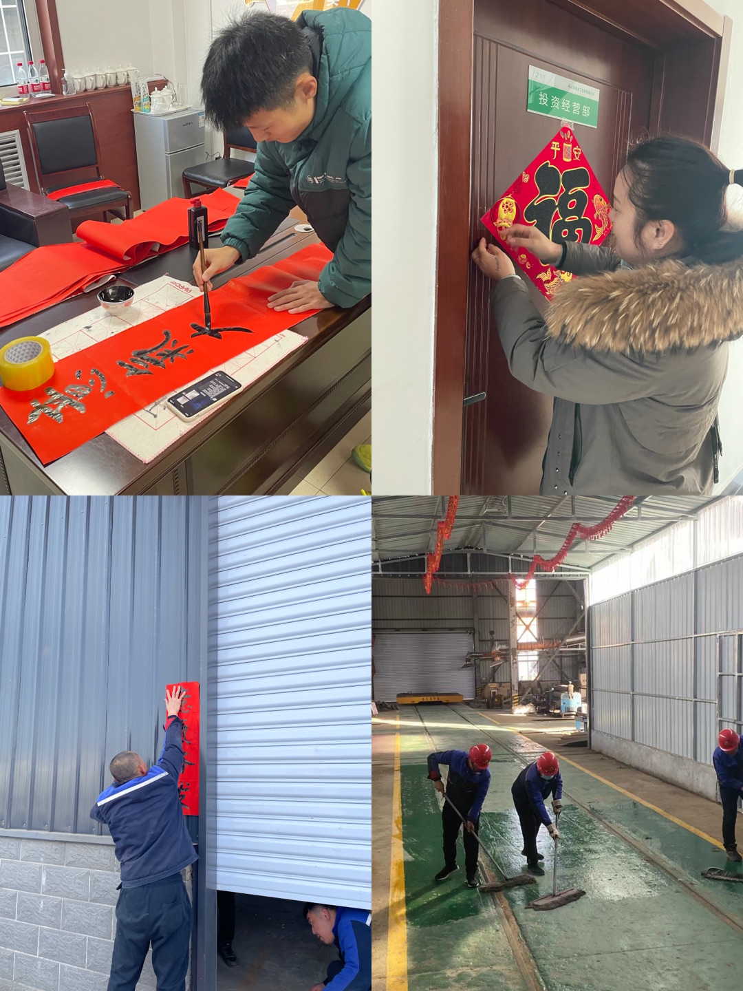 活動(dòng)中,水工機(jī)械公司的職工們?cè)趶S房門(mén)前掛上火紅的燈籠,貼上職工們親手書(shū)寫(xiě)的春聯(lián)。全體員工齊動(dòng)手,將公司里里外外打掃的整潔干凈,煥然一新,營(yíng)造了濃濃的節(jié)日氣氛。