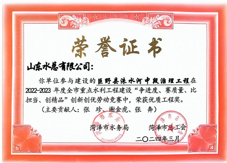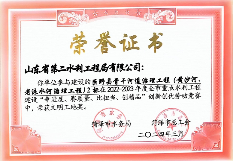 近日,菏澤市水務局、菏澤市總工會公布了“2022-2023年度全市重點水利工程建設“爭進度、賽質(zhì)量、比擔當、創(chuàng)精品”創(chuàng)新創(chuàng)優(yōu)勞動競賽”獲獎名單,公司及權屬單位二局有限公司共榮獲優(yōu)質(zhì)工程1項、文明工地2項、QC成果1項,優(yōu)秀項目經(jīng)理1項。
