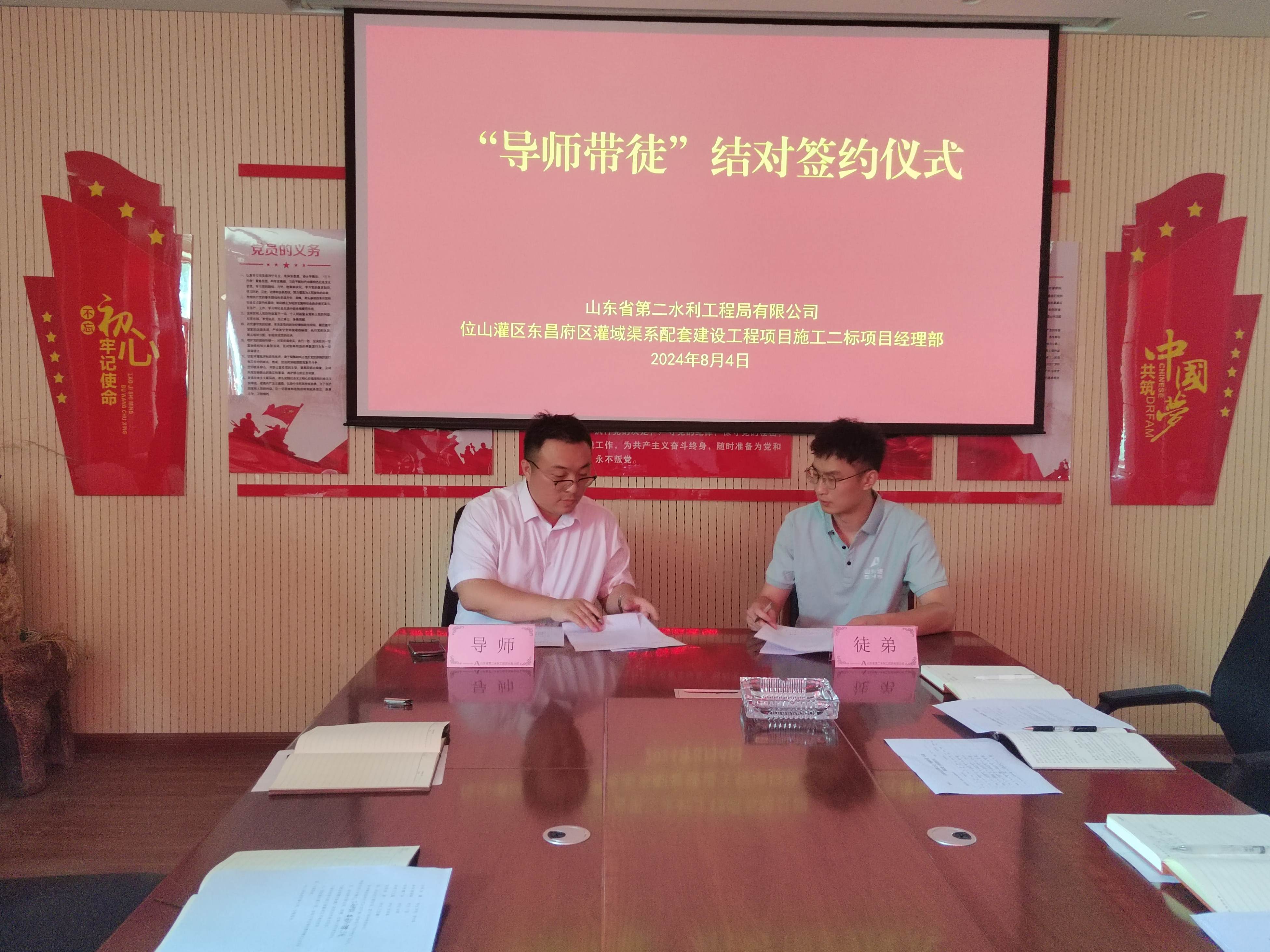 近日,二局有限公司位山灌區(qū)東昌府區(qū)灌域渠系配套建設(shè)工程項(xiàng)目施工2標(biāo)項(xiàng)目經(jīng)理部舉行了“導(dǎo)師帶徒”結(jié)對(duì)簽約儀式。