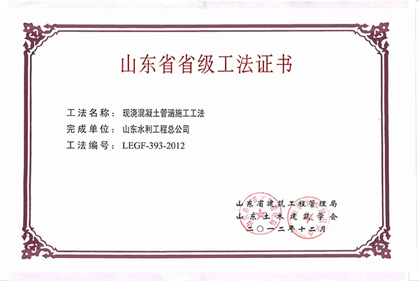 公司“現(xiàn)澆混凝土管涵施工工法”被評為2012年山東省省級工法