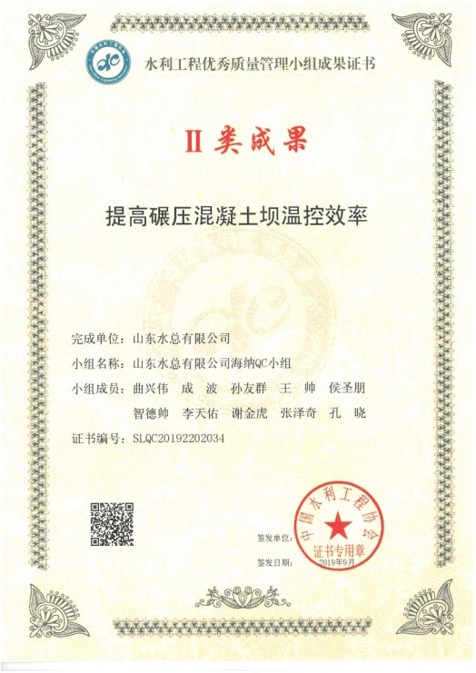 2019年9月24日,由中國水利工程協(xié)會舉辦的2019年度中國水利工程優(yōu)秀質(zhì)量管理小組成果發(fā)布,山東水總有限公司報送的《提高碾壓混凝土壩溫控效率》和《提高預(yù)制空心板氣囊安裝一次成型合格率》2項成果全部獲Ⅱ類成果獎。
