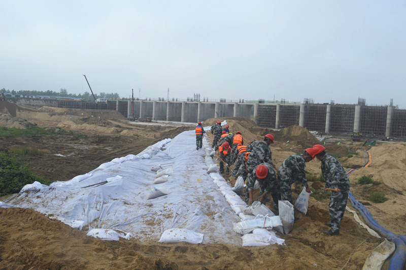 防洪度汛演練模擬的是洪水來襲,值班人員巡視圍堰時發(fā)現(xiàn)薄弱處有決口的危險,值班人員迅速向報告,召集搶險大隊成員攜帶防汛工具和物資迅速集結(jié),通過填筑沙袋、拋石、打樁等措施消除圍堰隱患,保證了工程安全。