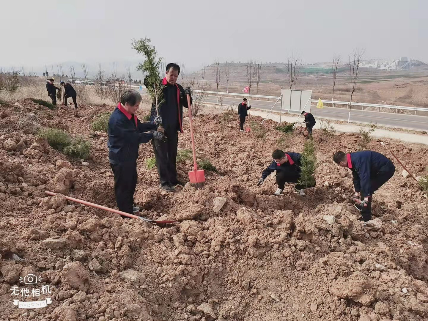 植樹(shù)活動(dòng)現(xiàn)場(chǎng),三、五人為一組分工合作,有的揮鍬鏟土、有的扶樹(shù)填土,配合默契,場(chǎng)面繁忙有序。黨員志愿者們積極踴躍參與,以飽滿的熱情投入到“播綠添彩”行動(dòng)中。經(jīng)過(guò)一番辛勤勞作,新栽種的樹(shù)苗在上坡山構(gòu)成一道靚麗的風(fēng)景線。
