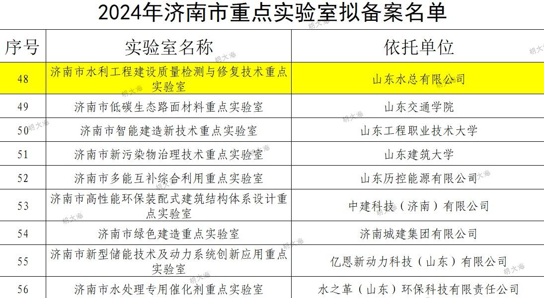 近日,濟(jì)南市科技局組織開展了2024年度濟(jì)南市重點(diǎn)實(shí)驗(yàn)室備案工作。經(jīng)歷下區(qū)審核推薦、專家評(píng)審、現(xiàn)場考察、濟(jì)南市科技局黨組會(huì)研究,公司申報(bào)的濟(jì)南市水利工程建設(shè)質(zhì)量檢測(cè)與修復(fù)技術(shù)重點(diǎn)實(shí)驗(yàn)室順利通過認(rèn)定。