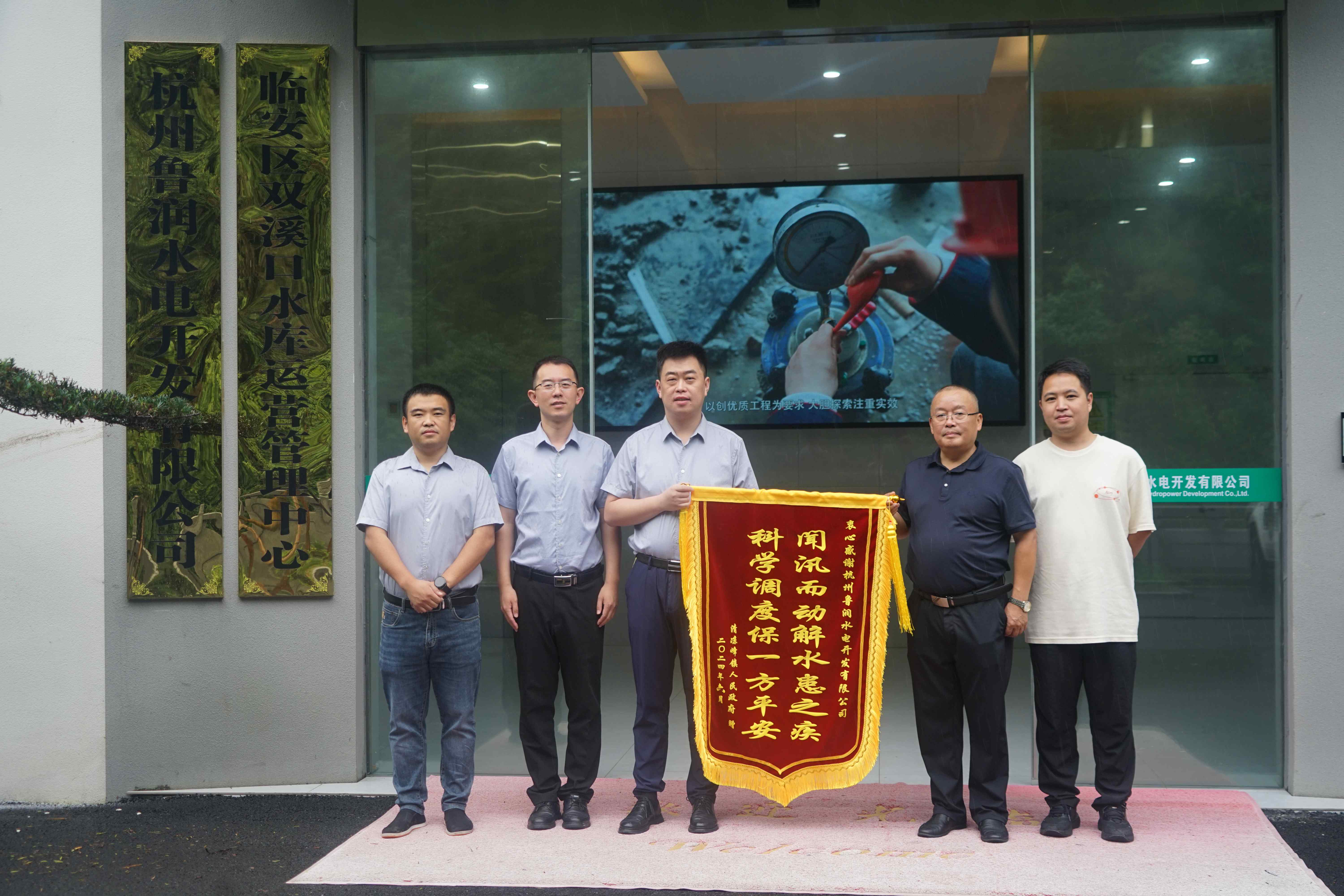 7月4日,浙江省正式出梅,臨安區(qū)清涼峰鎮(zhèn)黨委委員方春輝代表鎮(zhèn)政府送來了一面沉甸甸的錦旗——“聞訊而動解水患之急、科學(xué)調(diào)度保一方平安”,表達了對雙溪口水庫防洪利器作用的認可和杭州魯潤公司科學(xué)嚴(yán)謹高效工作的肯定。