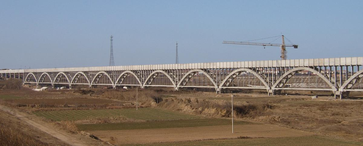 山東省膠東地區(qū)引黃調(diào)水工程淘金河渡槽:全長1373米,最大跨度50.6米。采用上承式預(yù)應(yīng)力砼拉桿拱式矩形渡槽、簡支梁式預(yù)應(yīng)力砼矩形渡槽和簡支梁式普通鋼筋砼矩形渡槽等三種結(jié)構(gòu)形式,設(shè)計輸水流量16.3立方米/秒。