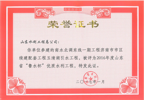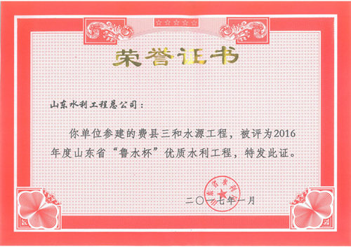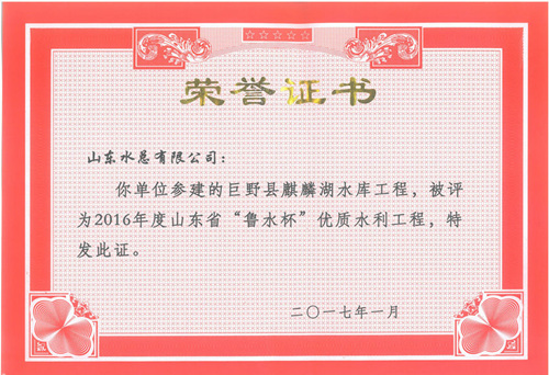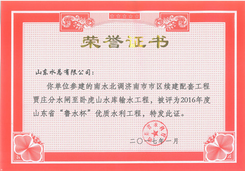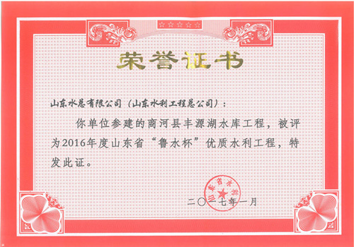 公司“招遠(yuǎn)市勾山水庫除險(xiǎn)加固工程”等八項(xiàng)工程被評為2016年度山東省“魯水杯”優(yōu)質(zhì)水利工程